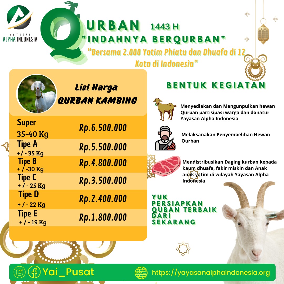 Yayasan Alpha Indonesia menerima dan menyalurkan Hewan Qurban. Kami membantu dari Penyembelihan Hewan Qurban Bapak dan Ibu sampai kepada Pendistribusian nya.